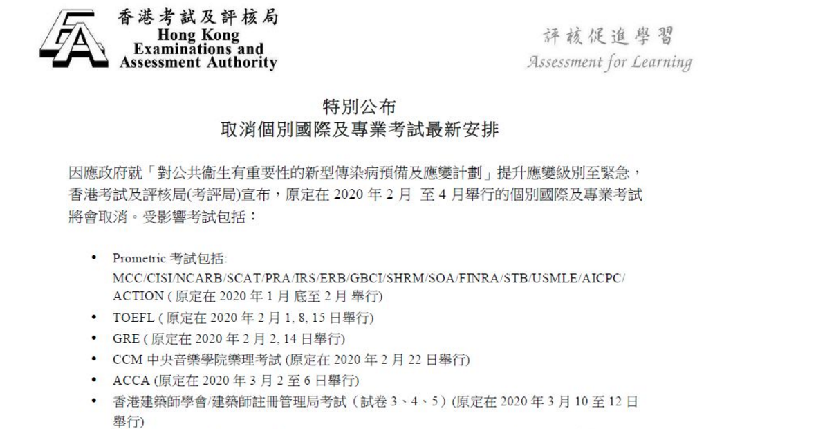 除此之外, 香港、澳门地区3月托福考试也被推迟了! 想要转考的同学,也只能被安排在4月中旬。而4月考试是否能如期进行还要根据疫情发展来定夺。如此来看,3月各大考试取消已成定局。