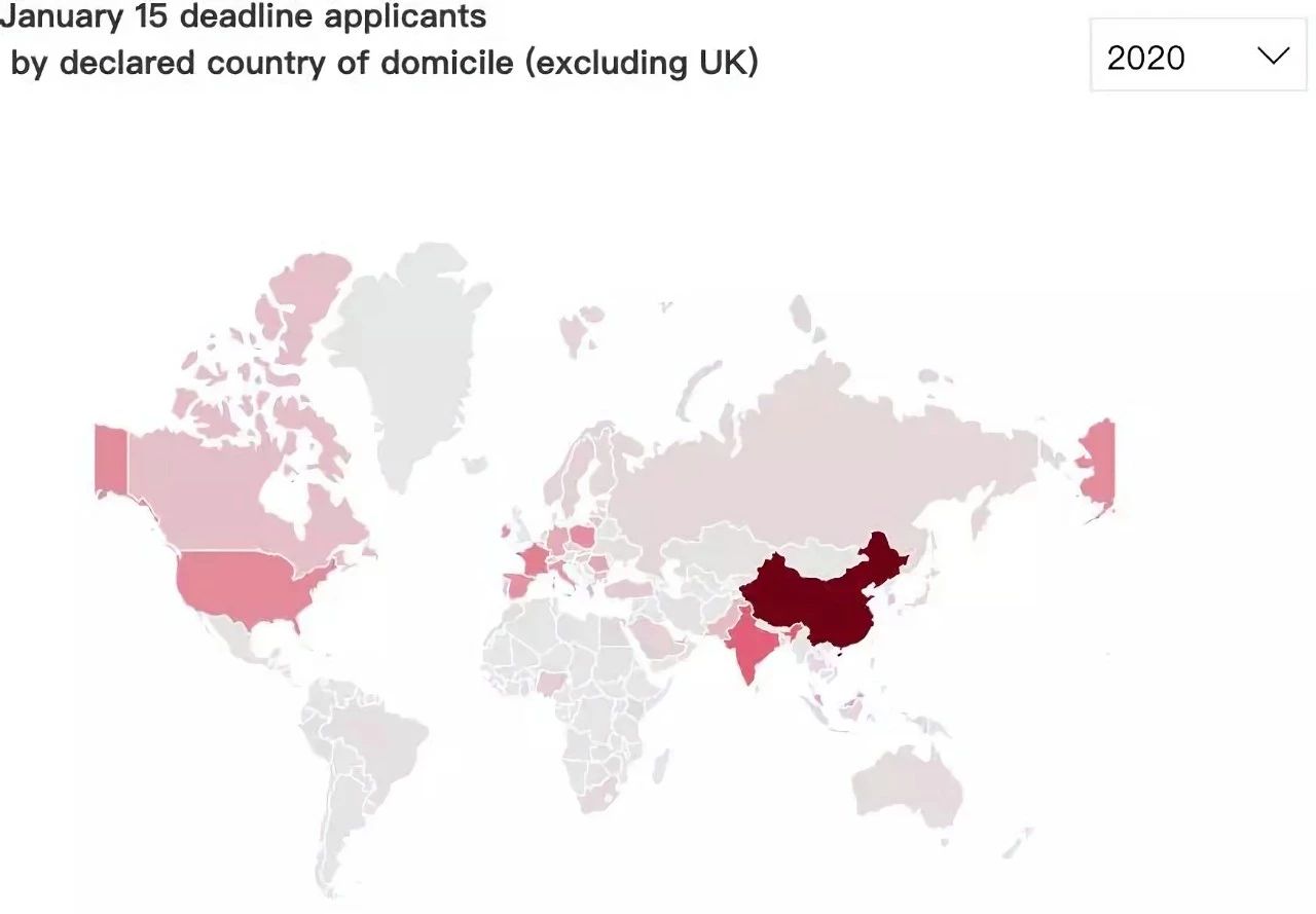 我们可以看到,在UCAS制作的图中,中国在地图上的颜色最深,是除英国之外提交申请人数最多的国家。