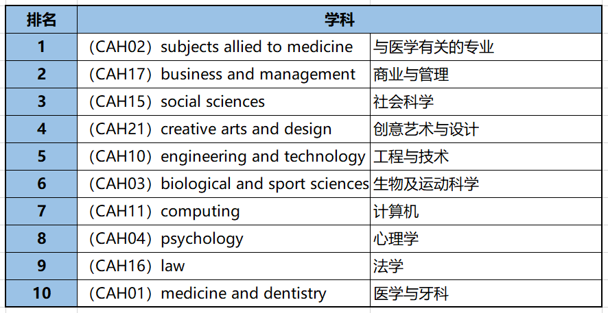 UCAS也公布了各大学科的申请情况,以下是10大热门学科排行榜。