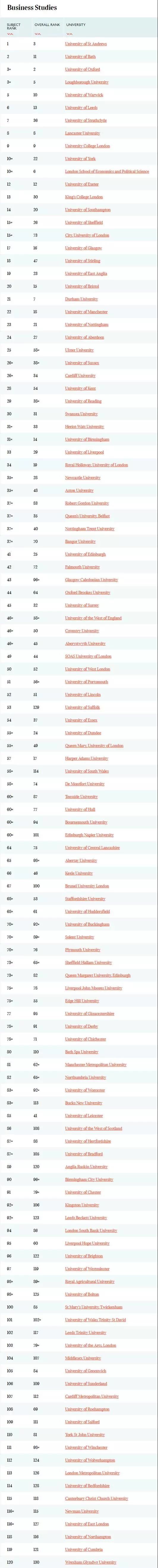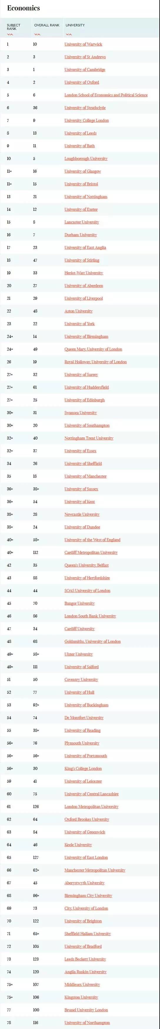 以下是2020年TIMES专业排名 Accounting an Finance、Economics、Business Stuies**专业 英国大学排名