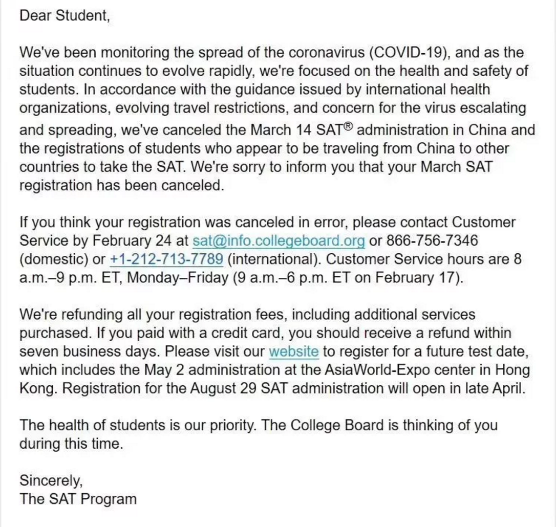 相信今天很多同学都收到了来自CB关于取消3月SAT考试的邮件,邮件中表示