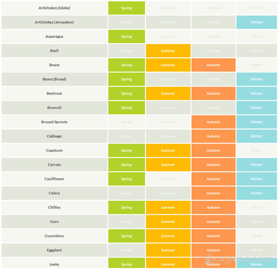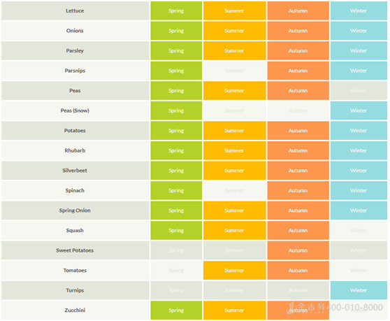 按照这份表格,秋季的应季蔬菜有:豆子、甜菜、抱子甘蓝、卷心菜、辣椒、胡萝卜、菜花、芹菜、玉米、黄瓜、茄子、韭葱、生菜、洋葱、欧芹、欧防风、土豆、大黄、莙薘菜、菠菜、南瓜、番薯、番茄、西葫芦等。