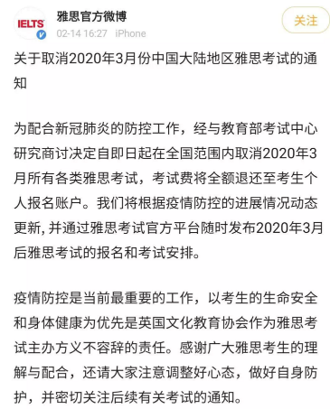 2月16日下午四点,雅思官方微博宣布:为配合新冠肺炎防控, 取消中国大陆3月所有类型雅思考试!