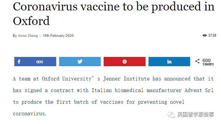 根据cherwell2月17日的报道,牛津大学詹纳研究所(Oxfor University’s Jenner Institute)的一个研究小组宣布, 它已经与意大利生物医学制造商Avent Srl签订了一份合同,以生产第一批预防新型冠状病毒的疫苗。
