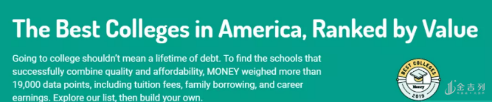 前不久,美国Money杂志在综合了美国教育部,Peterson's,Payscale的数据后,全面分析和对比了一波美国大学的性价比,并评选出了2019年性价比最高的大学排名榜单,MONEY的评比标准主要分为3大类:教育质量,可承受度和产出。