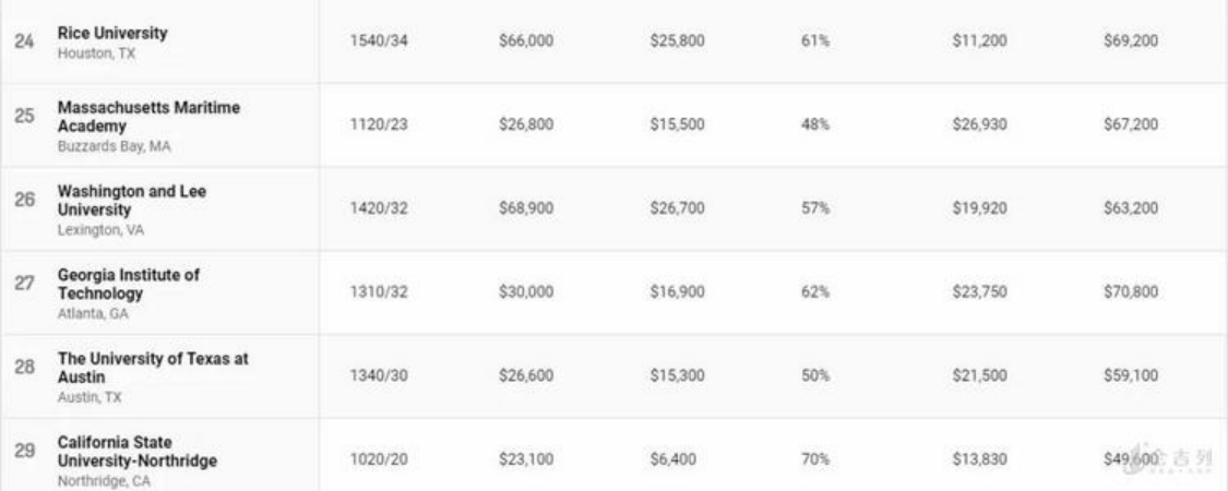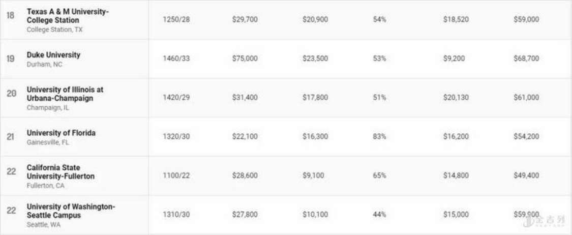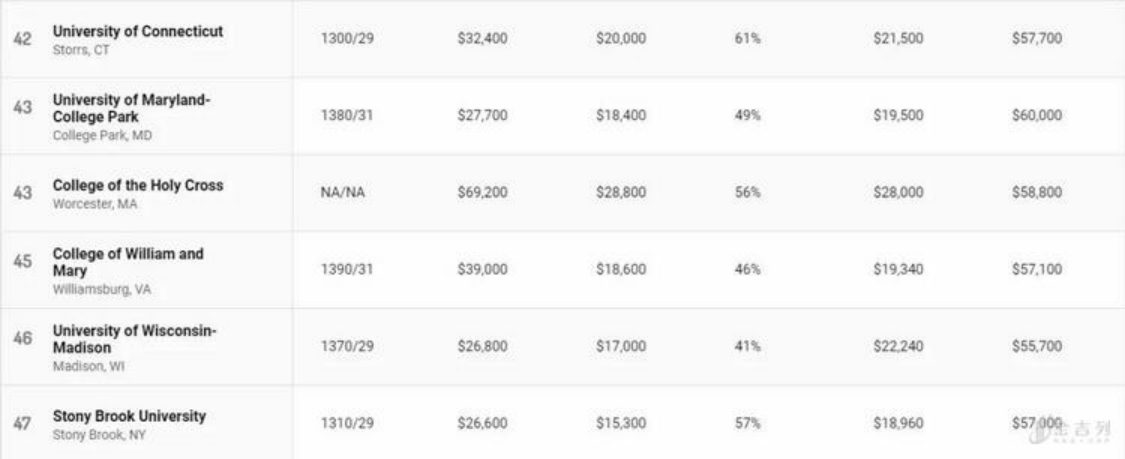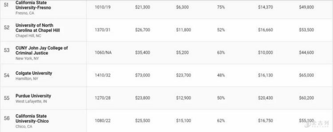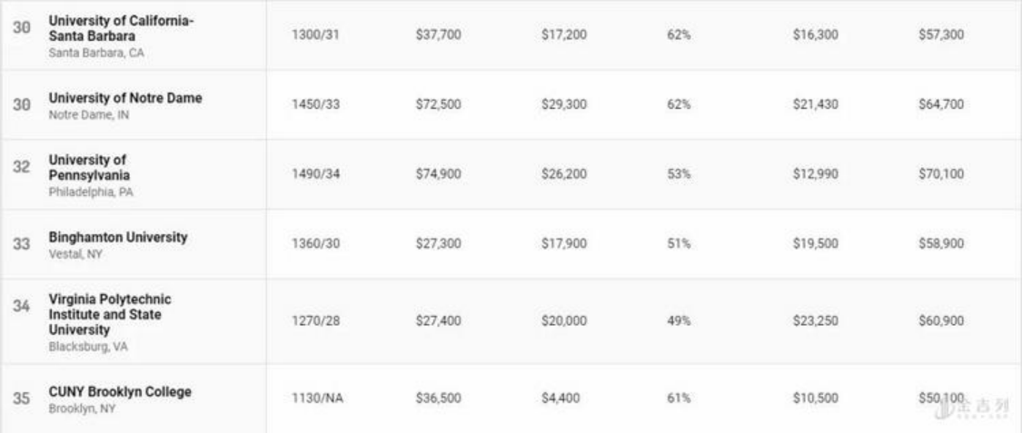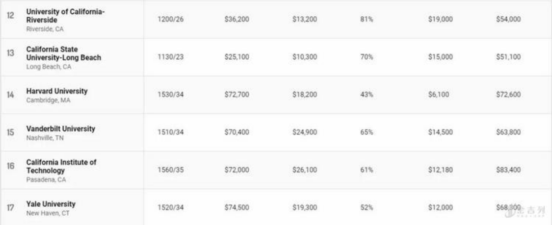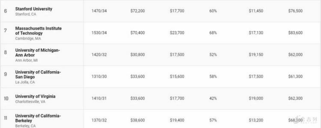 公立大学在榜单上表现亮眼,排名前十位中公立大学占据七席,其中加州大学占据了四个名额。然而公立大学的“高性价比“与州内学生学费(in-state tuition)相对低廉有关。