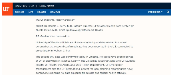 事情的起因是这样的,尽管新型冠状病毒在佛罗里达州尚未发现,但是随着疫情在全球快速传播,再加上佛罗里达大学校园内有将近6000名国际学生,所以不免一时间人心惶惶。