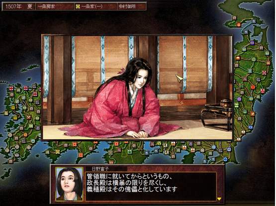 室町幕府八代将军足利义政的正室。父亲是日野政光,母亲是北小路禅尼(日野苗子)。由于日野家代代与足利家保持联姻的关系,富子在十六岁时嫁给当时二十岁的将军义政做正室。在1459年时生下第一个孩子,但小孩一出生就夭折了,当时有传说这件事是义政的乳母今参局在暗中诅咒,于是今参局因此被判流放到琵琶湖的冲之岛,而她在流放的路上就自杀了。