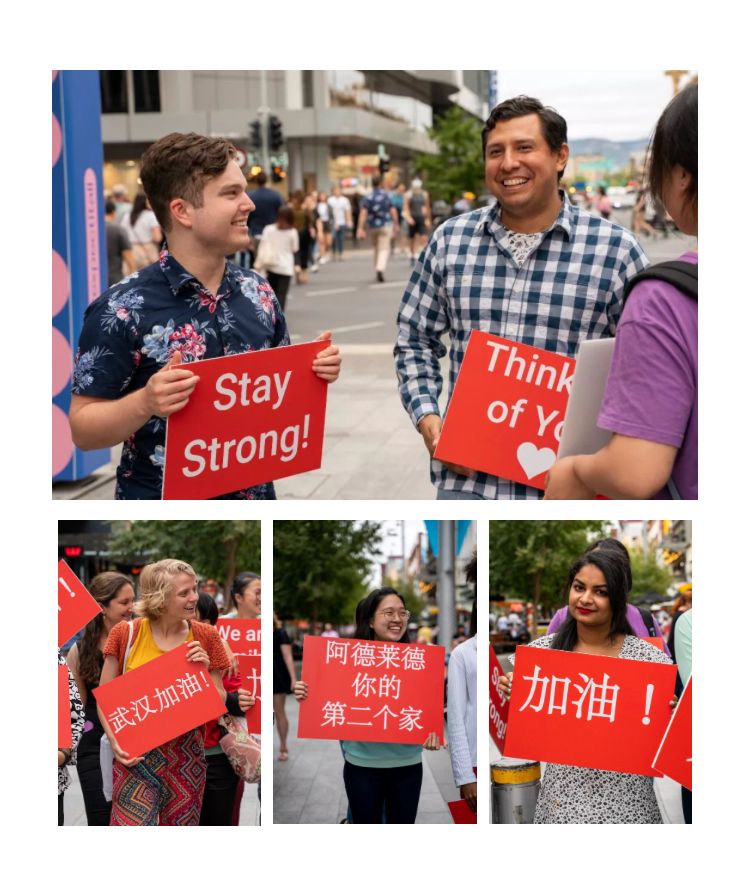 这几天,在遥远南半球的澳大利亚南澳州,有着一群时刻牵挂着中国疫情的海外友人和学生朋友们。他们在南澳州教育推广署StuyAelaie的号召下,走上街头,为中国、更为他们的中国朋友们加油打气!他们录下一段心意满满的视频,坚定地和中国站在一起,期盼早日渡过难关!