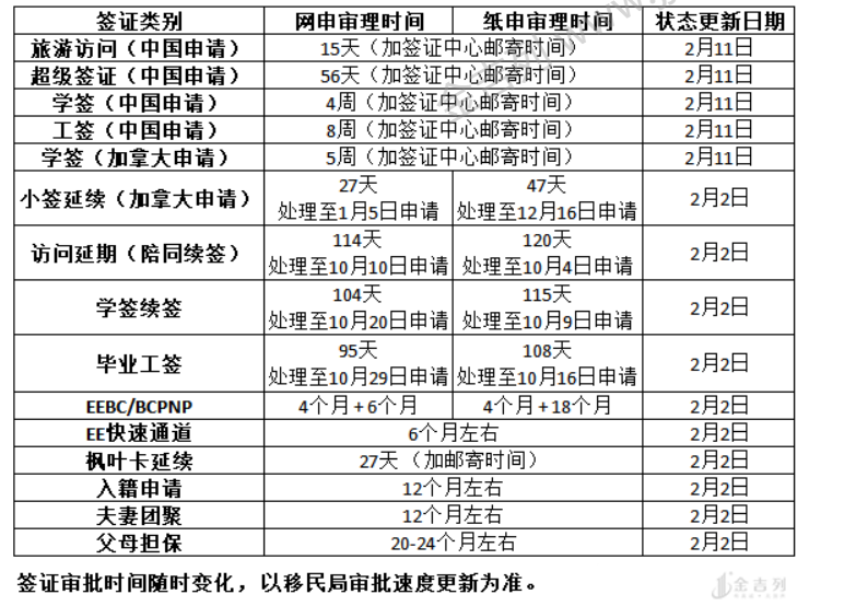 根据加拿大中国签证中心消息,加拿大各类签证审理进度已更新至2月11日,具体办理周期及相关进度如下:
