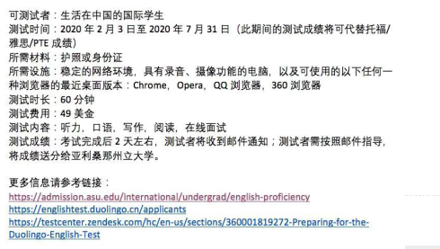 来让我们看看什么是Duolingo考试吧。 比如亚利桑那州立大学就非常贴心地提供这样一份考试指南: