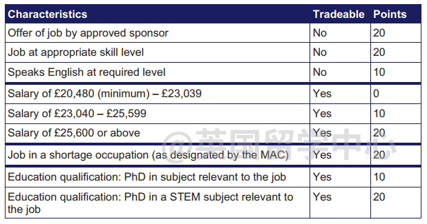 有工作且雇主可提供担保(20分) 工作达到一定技能水平(20分) 满足一定的英语水平(10分)