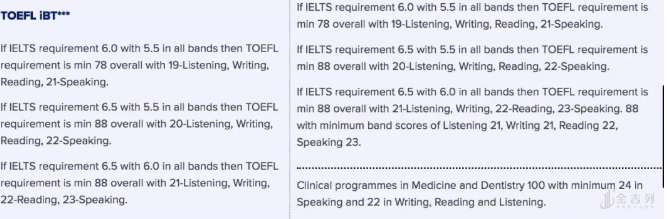 3. 大学可以接受普通雅思、PTE和TOEFL成绩直读研究生正课。 分数要求为:PTE所有专业均要求总分62,所有单项不低于51。TOEFL见下图。