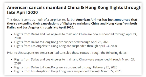 根据CNBC的报道,AA美国航空公司将其中国大陆及香港航班的暂停期限从之前宣布的3月27日延长至4月24日。