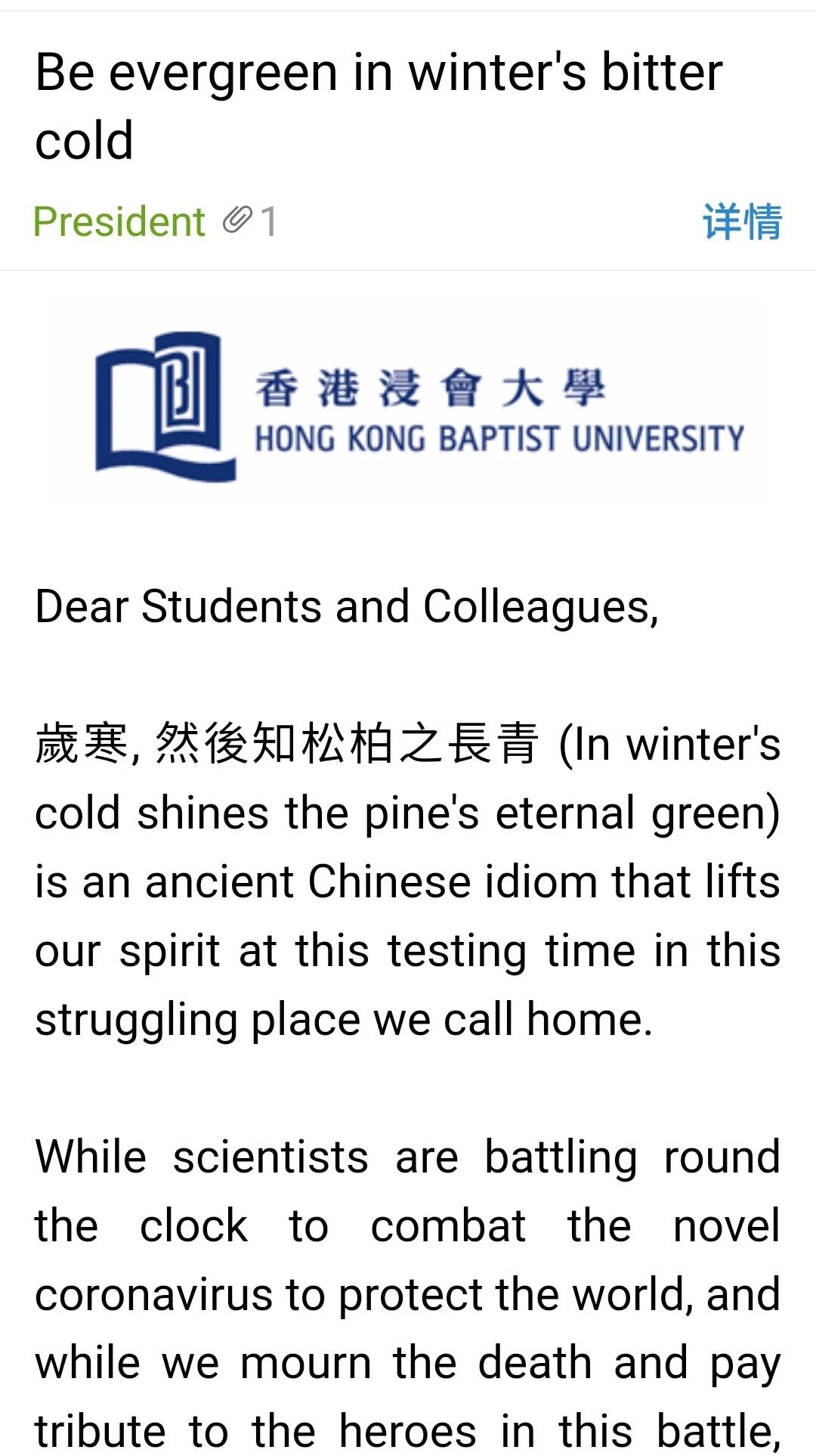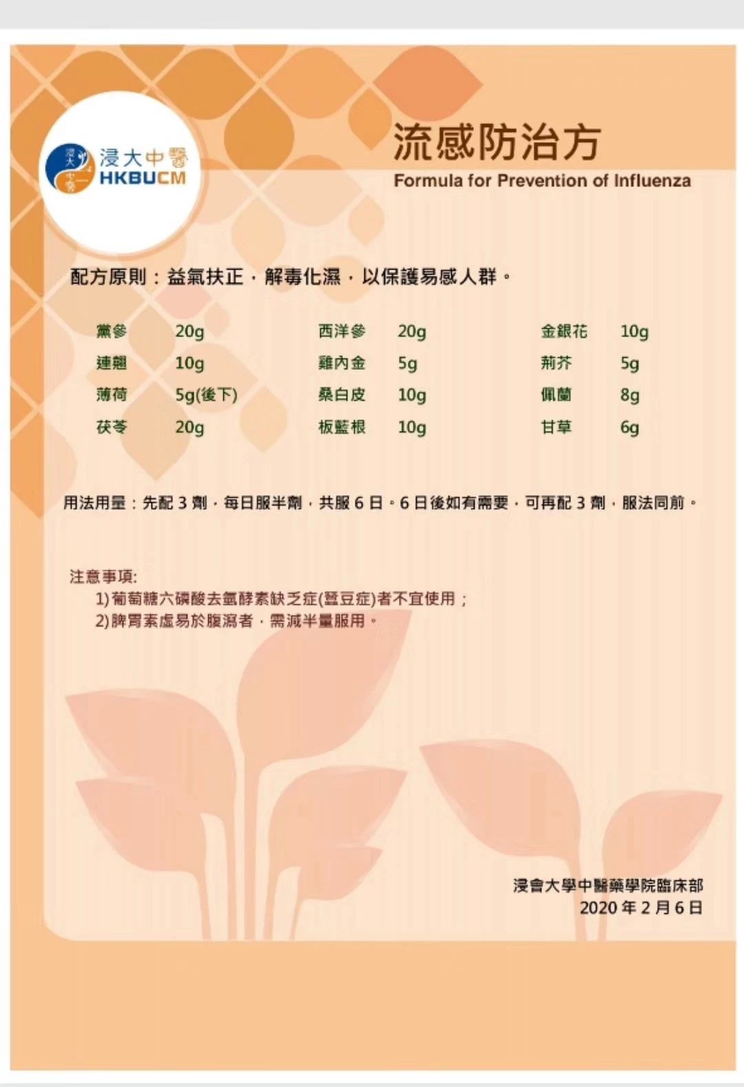 信的一开头便引用了中国的古谚语:岁寒,然后知松柏之长青。来勉励浸大的莘莘学子在逆境中保持坚韧,向上的品质。 信中也讲述了浸大人也在为打胜这场抗疫仗做出微小的贡献。来自浸大中医药学院的教授Prof Bian Zhaoxiang 配置了一副能清肺明目,提高免疫力的中药配方,并捐赠了1万剂药方给有需要的人。(药方如下 )