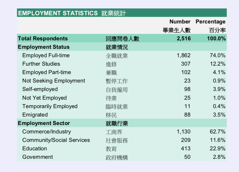 毕业生从事的工作主要集中在工商界与社会服务行业,也有少部分选择进入政府机构工作。