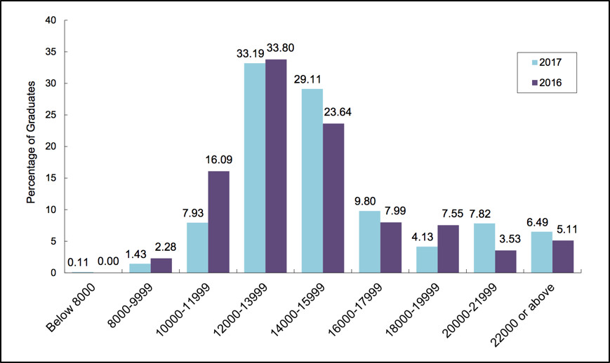 提到毕业薪酬,浸大毕业生起薪相比于八大稍显逊色。可能这与浸会没有设置比较热门的工科,法律等专业有关。据2017年的统计,超过一半的毕业生 ,工资都集中在 12,000-15,999港币 这个区间。
