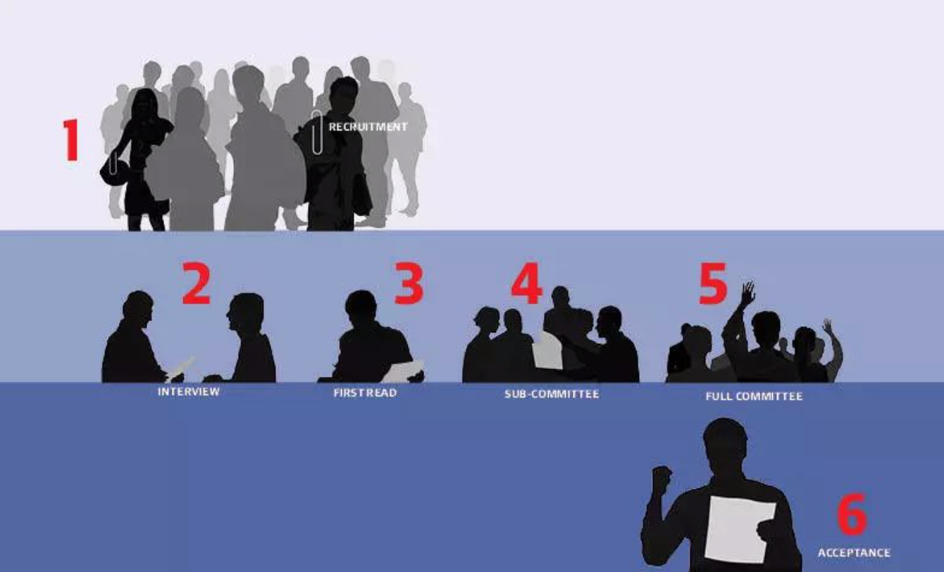 分属委员会举行投票,决定将哪些申请者转交给全体招生委员会,该委员会由40名申请审核官组成。学生在分属委员会必须获得 多数的赞成票 才能进入下一阶段。