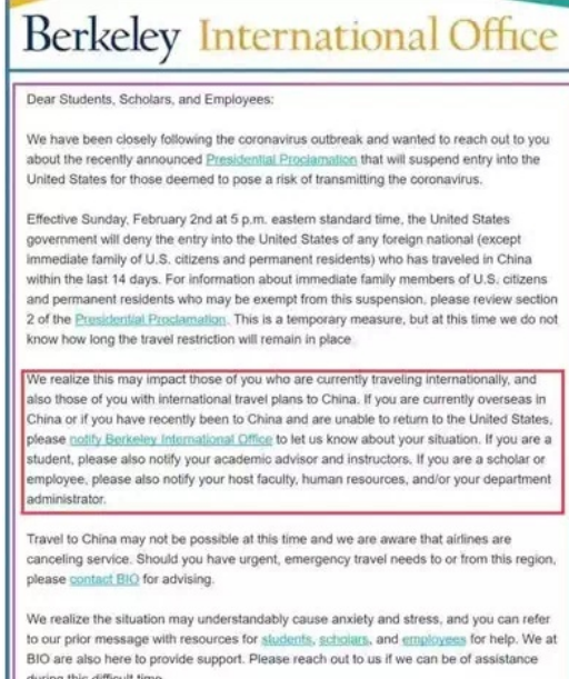 加州伯克利:“如果你现在正在中国并且无法返回美国的话,请与我们联系,让我们知道你的处境”。