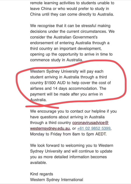 "虽然学生们目前不能够直接从中国入境澳洲,但澳洲官方还是允许由第三国入境(但必须在离境中国后超过14天,并未和感染新冠肺炎的人接触)。西悉尼大学了解部分学生为了不耽误学习,选择此方案到澳洲。因此,西悉尼大学体恤学生需要花额外的费用负担到第三国的旅费及14天的生活费,做出了补助每位学生1500澳元的决定。"