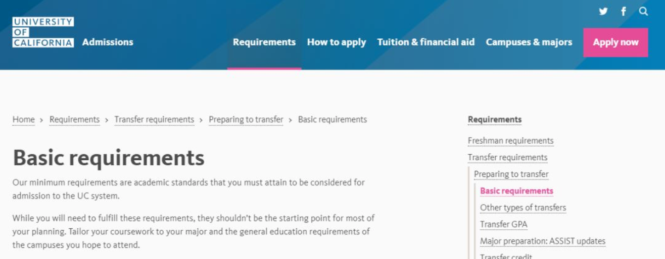 要注意, 绝大多数情况下,学校最多只接受2年的课程学分 ,多了就浪费了!另外,由于只有两年的成绩,所以很多美国大学还会要求学生提交高中成绩单。 咱们以加州大学为例,UC在官网中给出了学生转学的具体要求,如下——