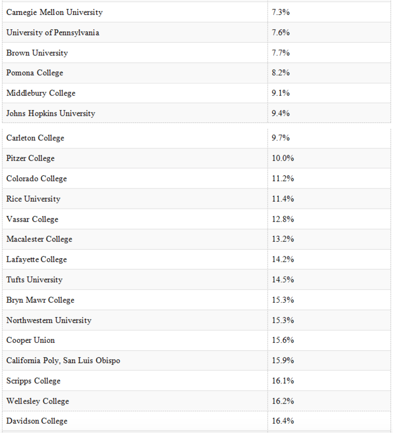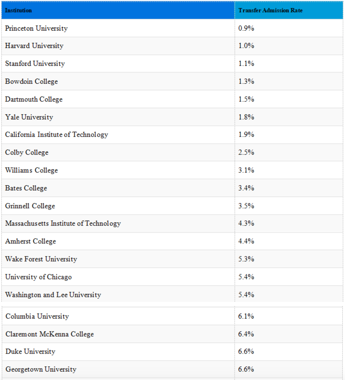 其他“次尖”的学校是大家最好的选择,各个学校2019年的转学入学率分别是: 完整名单: https://www.collegetransitions.com/transfer-amission-rates