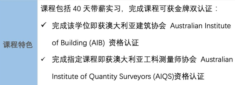 完成该学位即可获得 澳大利亚建筑协会 Australian Institute of Builing (AIB) 资格认证;更可同时获得 澳大利亚工料测量师协会 Australian Institute of Quantity Surveyors (AIQS) 资格认证,从而实现 金牌双认证 。
