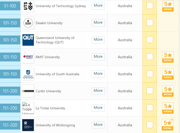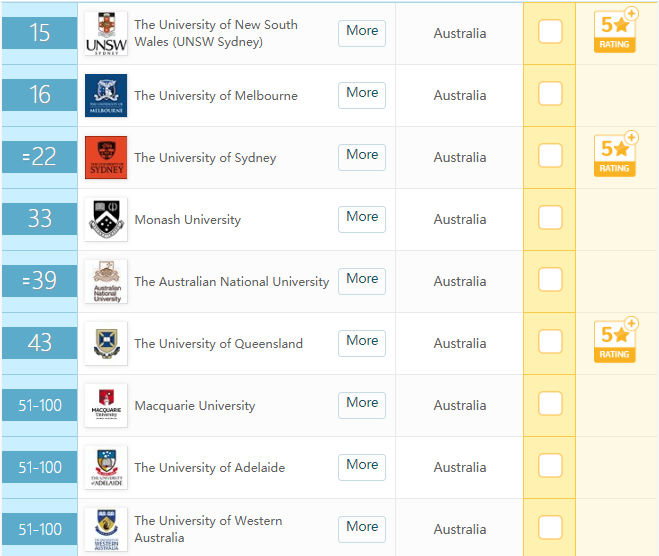 澳洲大学商科专业世界QS排名,以会计与金融专业排名为例: