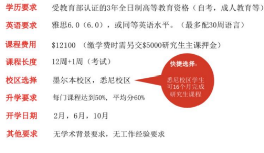入学要求: 学士学位,任何专业背景,专科学士或者本科毕业,没有学士学位的学生,可以通过Grauate Certificate in Business Stuies衔接硕士