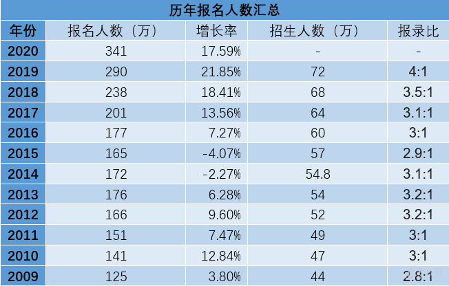 招生人数逐年增加,社会对人才的需求也在快速增长, 但报录比的数据却不容乐观,从2.9 : 1到4:1,录取难度越来越大,机会只会留给更优秀的人。