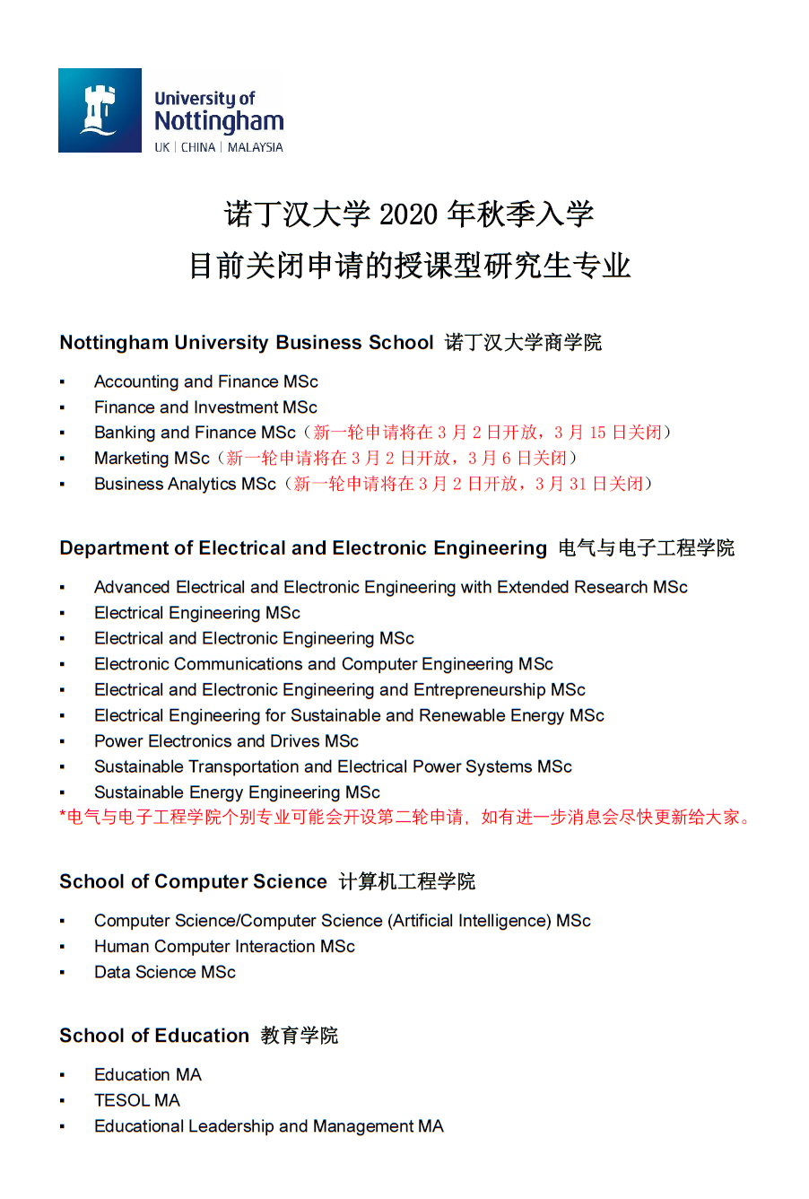 由于今年收到大量来自中国优秀学生的申请,为提高国际学生国籍多元化,我们决定于2020年1月2号(英国时间)关闭以下来自中国大陆学生的申请(但以下专业仍可接受毕业于中国大陆以外的中国籍学生申请)。
