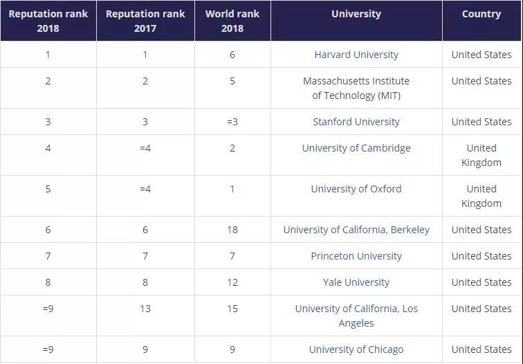 2018年世界大学声誉排名(Worl Reputation Rankings)前十基本上没有变化: