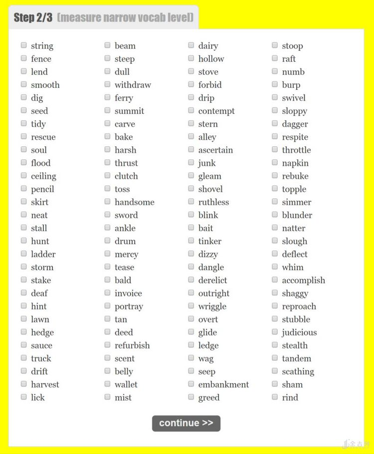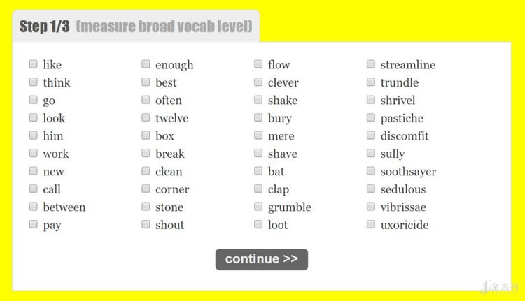 该网站的测试流程一共分为 3 步。第 1 步是测试日常用词。你只需在单词表中勾选出自己认识的单词就好。但是,切记一定要对自己诚实, 不认识的单词不要选,见过但不记得意思的单词也不要选 。