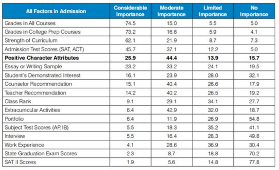 但是,在所有影响招生决策的因素中,“性格特征”竟然在排名前五的位置,对录取结果达到将近30%的影响程度。 这虽然不算硬实力,但说是软实力也差强人意,无论如何,申请者的性格竟然也能影响招生官的判断?!