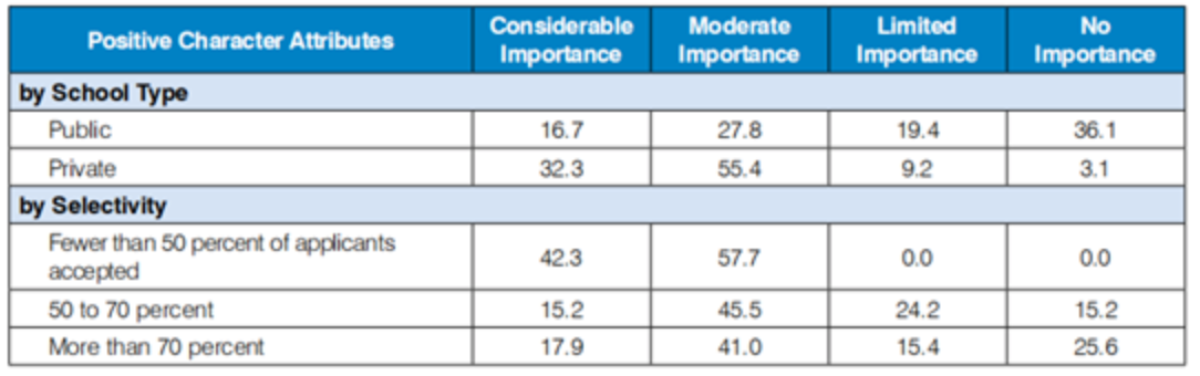 不仅如此,录取率低的大学(50%)比录取率高的学校更重视申请人的性格特征,因为那些高度挑剔的机构的申请人往往有更高的考试分数,所以招生人员倾向于考量更广泛和更全面的因素。