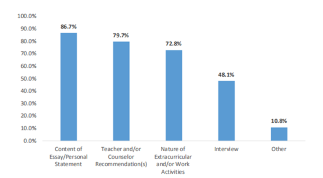 该报告中还说明了大学的评估人员如何对申请人的性格因素进行评估。 其中,论文/个人陈述、推荐信、课外活动特征/工作经验是最常见的评估方法。 有趣的是,这恰巧表明了大学对软实力的要求是合理的,因为它们可以证明一个人的内在价值,这是一个单纯的考试分数无法证明的。
