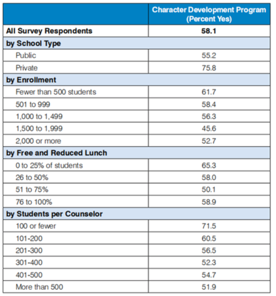 因此,与公立高中相比,性格培养计划在私立学校中更加普遍,主要是占据课外活动的比例,私立学校为41%,公立学校为12%。