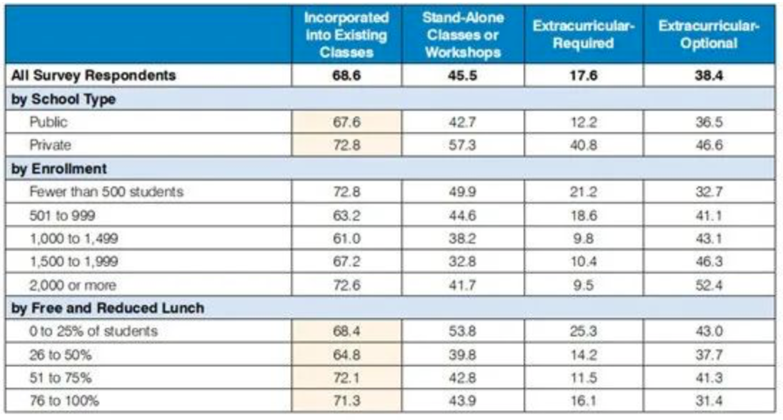 事实证明,具有性格教育计划的学校在很大程度上将其融入了更广泛的学校课程中,占现有课程的69%,占正常教学课程的46%,占可选课外活动的38%和必选课外课程的18%。
