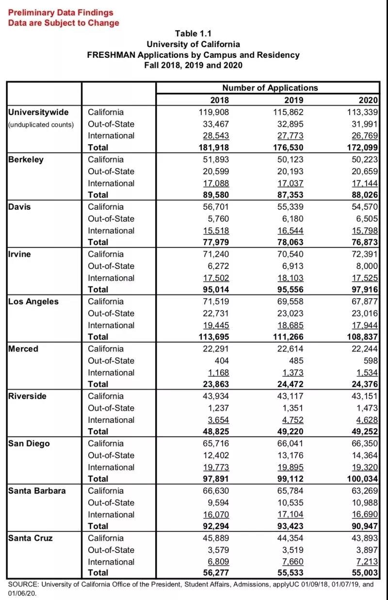 近日,加州大学公布了2020秋季入学申请的数据,这个申请季共收到215,162份入学申请,比2019年秋季(217,650份)减少了1.1%,新生申请减少了4,431,下降2.5%。