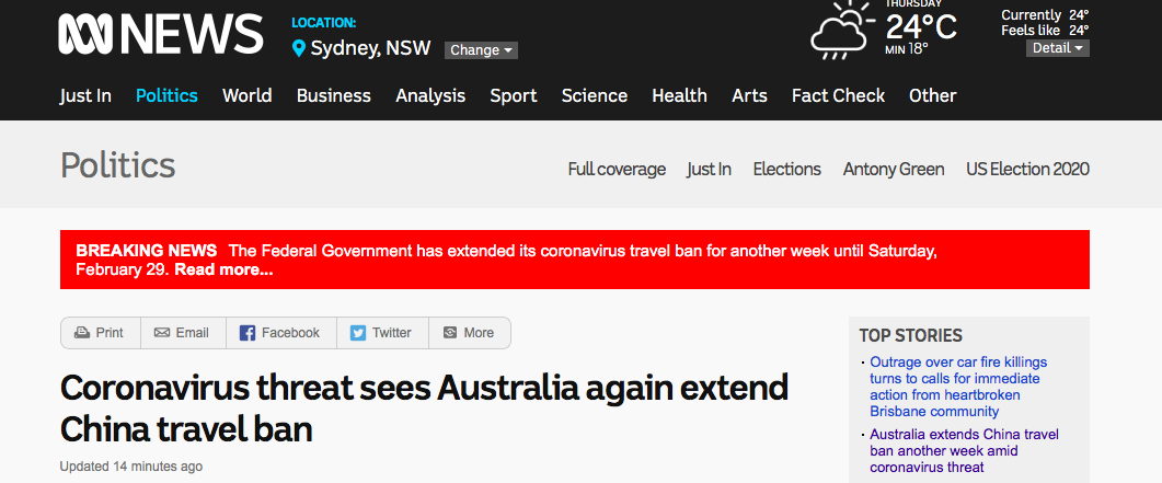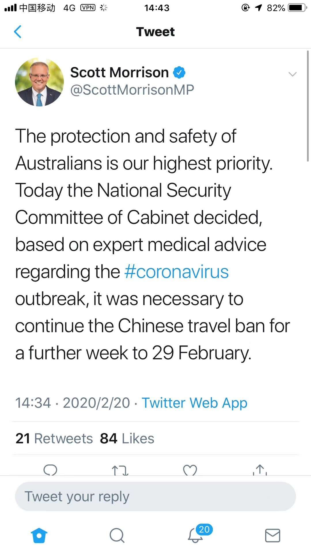 据澳媒报道,澳大利亚担心本次新冠病毒的影响,会在澳洲爆发和扩散,于是对中国的旅行禁令将会再延长一周! 直到2月29号结束。