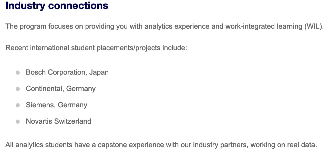 重点就是项目和实习部分了 最近的国际学生安置/项目包括: 日本博世公司 德国大陆 德国西门子 瑞士诺华 所有分析专业的学生都有一个与RMIT的行业合作伙伴一起工作的真正数据的经验。 你将进行行业项目,并通过亲自解决问题来发展你的分析能力。