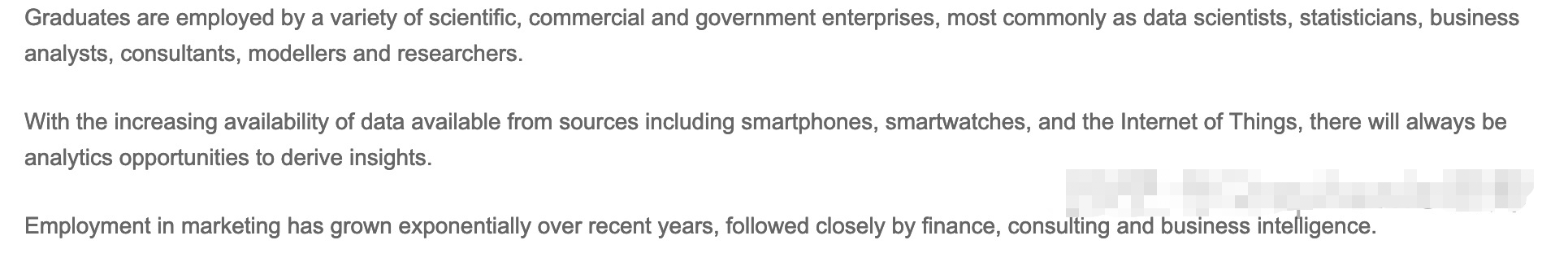 RMIT的Master of Analytics -分析硕士不仅为你提供了扎实的理论基础,也会有项目,或者实习机会让你将理论应用到实践中去,该过程当中,你将学习和使用最先进的统计软件。