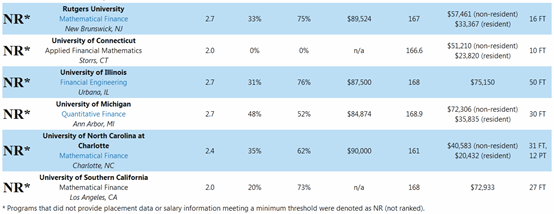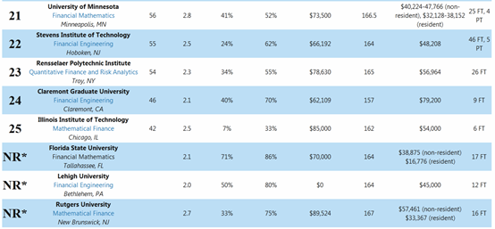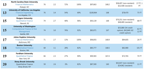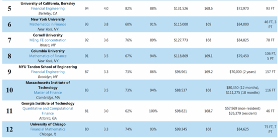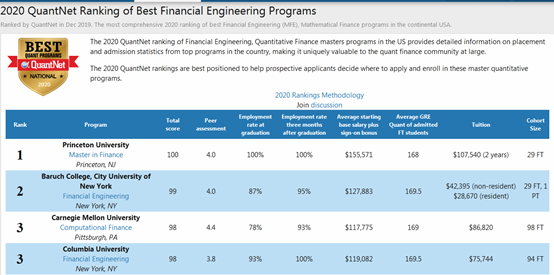 申请金融工程硕士或者金融数学硕士想要看专业排名怎么看?大部分学校和学生会参考两个比价权威的排名, TFE Times 和 QuantNet ,这两个排名有什么区别呢? TFE Times 更看重院校的整体名气( Reputation );而 QuantNet 更实在一些,排名标准更多地依据学生的就业情况( Employment ), TFE Times 之前分享过,今天给大家分享 2 020 年 QuantNet 排名: