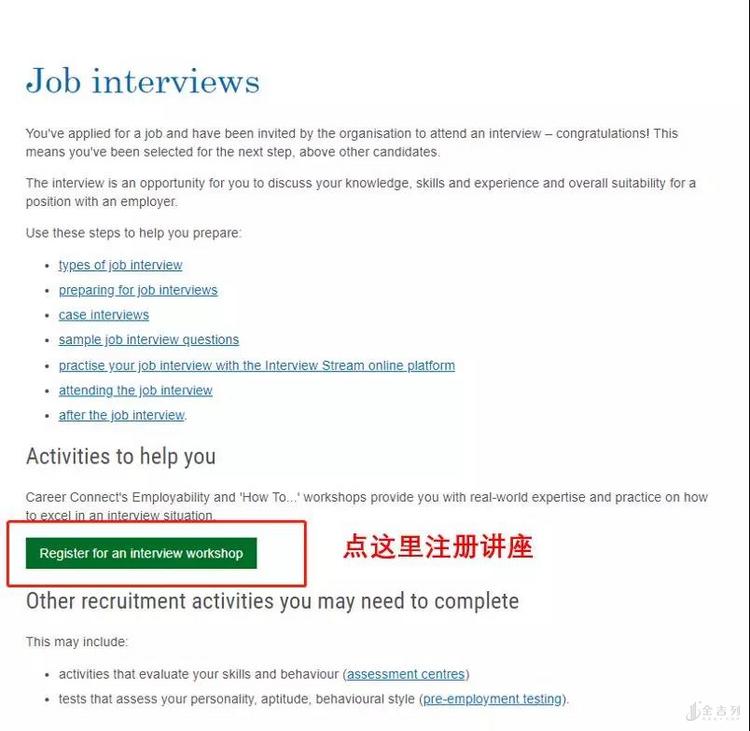 假如你想提升自己的面试技巧,那么可以在上述页面中点击'application reay',选择'job interviews'(如图2),即可找到相关讲座的注册信息。