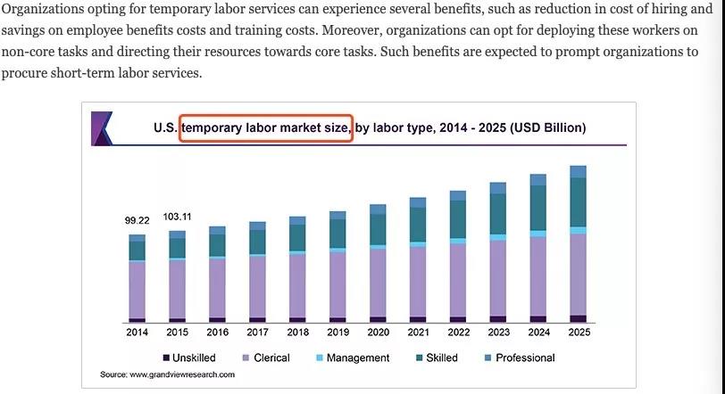近年来,全球临时工劳动力市场不断壮大。 因为当企业在非核心任务中急缺人力时,他们更倾向于雇佣临时劳动力, 这样既可以减少员工的福利成本与培训成本,又能专注于短期劳务,提升效率。