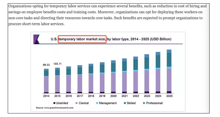 近年来,全球临时工劳动力市场不断壮大。 因为当企业在非核心任务中急缺人力时,他们更倾向于雇佣临时劳动力, 这样既可以减少员工的福利成本与培训成本,又能专注于短期劳务,提升效率。
