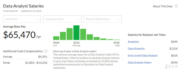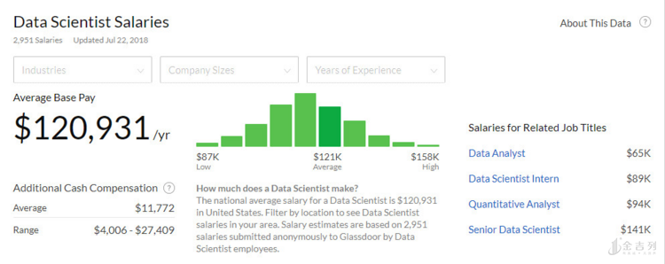 这些职业不管是国内还是国外 都是高薪的代表, 根据Glassoor的最新权威数据, 数据科学家相关类岗位的平均年薪高达 近13W美金! 入门级Data Analyst岗位也有将近7W美金的薪资。