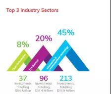 除上述之外, 加拿大全国天使协会(NACO)是由45家天使基金,以及40家孵化器和加速器组成的行业协会,主要是致力于投资处于早期阶段的创业公司。根据NACO发布2018的投资报告显示,仅2018年投资的总金额达到了1亿4千万美金,投资的主要分布也是在信息和通信技术、生命科学以及清洁技术这三个领域,分别占比45%,20%以及8%。
