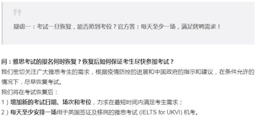而雅思主办方,英国文化教育协会也针对近期接连取消2月、3月大陆地区雅思考试的情况,官方回应 考试恢复后将增加新的场次和考试日期,每天至少一场UKVI雅思机考。