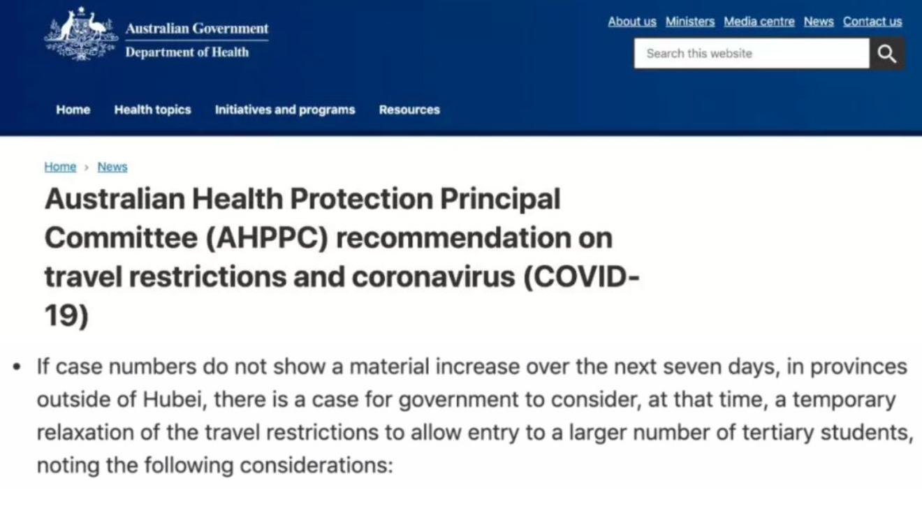 与此同时,澳大利亚政府卫生部网站上,也发布一条重磅消息: 如果病例确诊数量在接下来的7天中没有实质性增长,那么政府需考虑暂时放宽除湖北以外省份的旅行限制,以让更多大学在读的留学生入境。